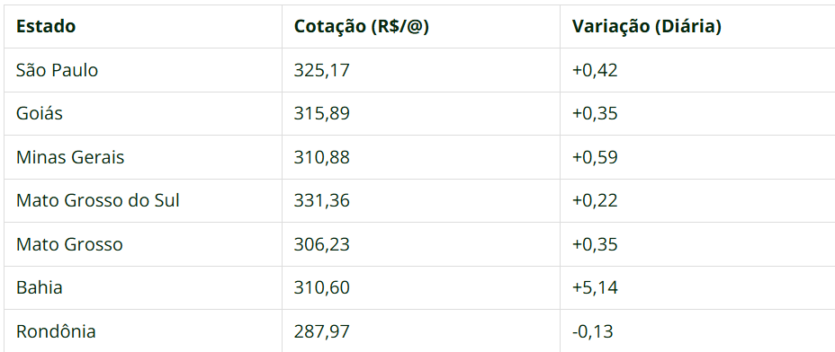 Já São Paulo registrou uma leve variação positiva, com a arroba indo de R$ 324,75 para R$ 325,17, e Mato Grosso do Sul se manteve como destaque, com média de R$ 331,36 .